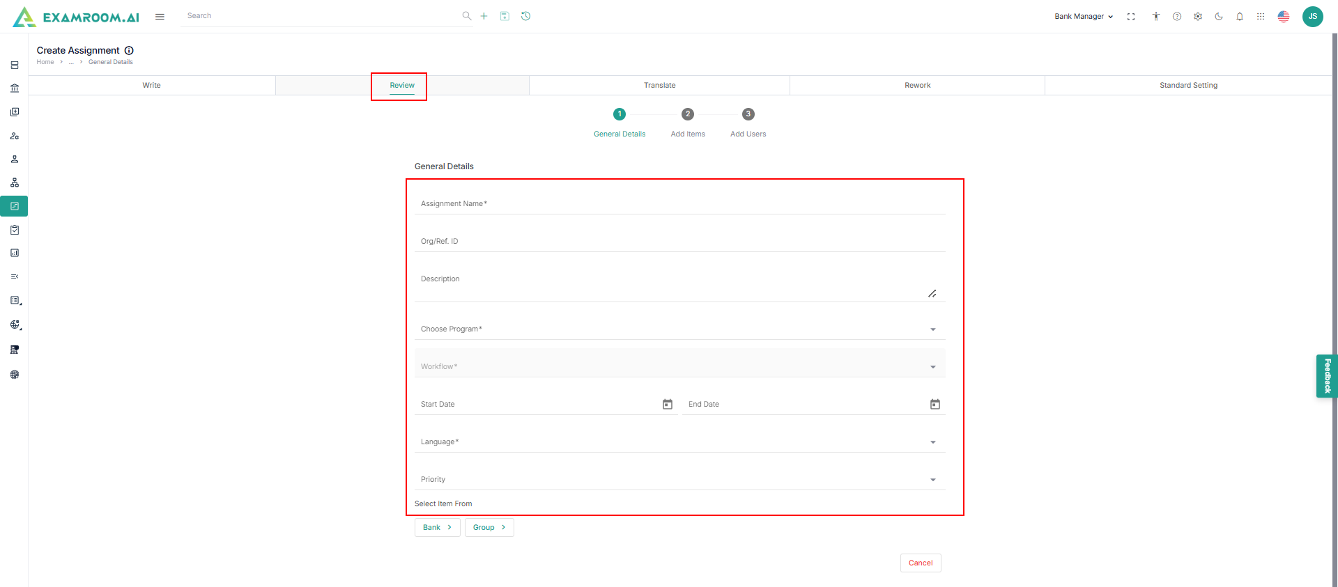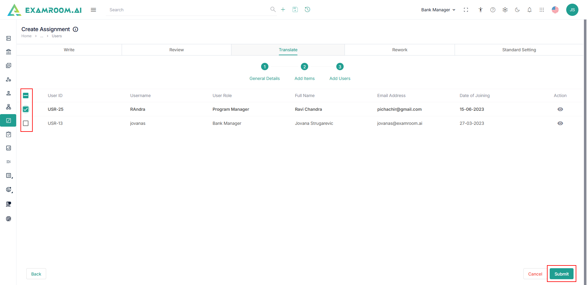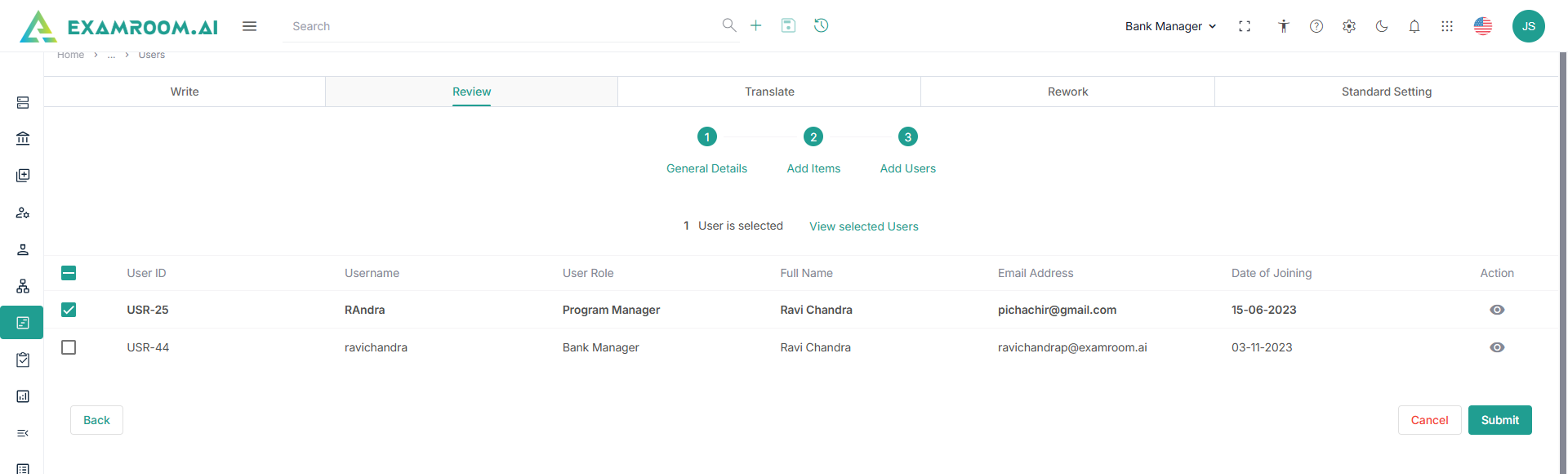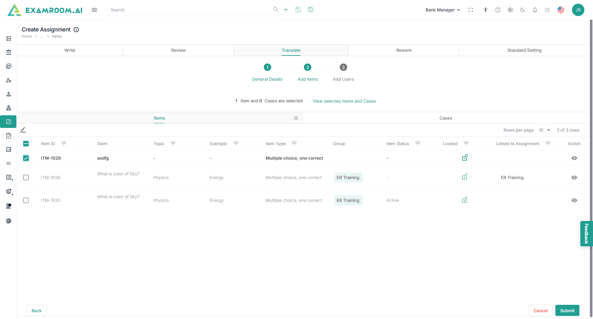 Note: The user should add items to the bank or create a group of items for the selected program to display them in the item list. For Group creation, refer to the Group Creation. - Select an Item and click Submit.