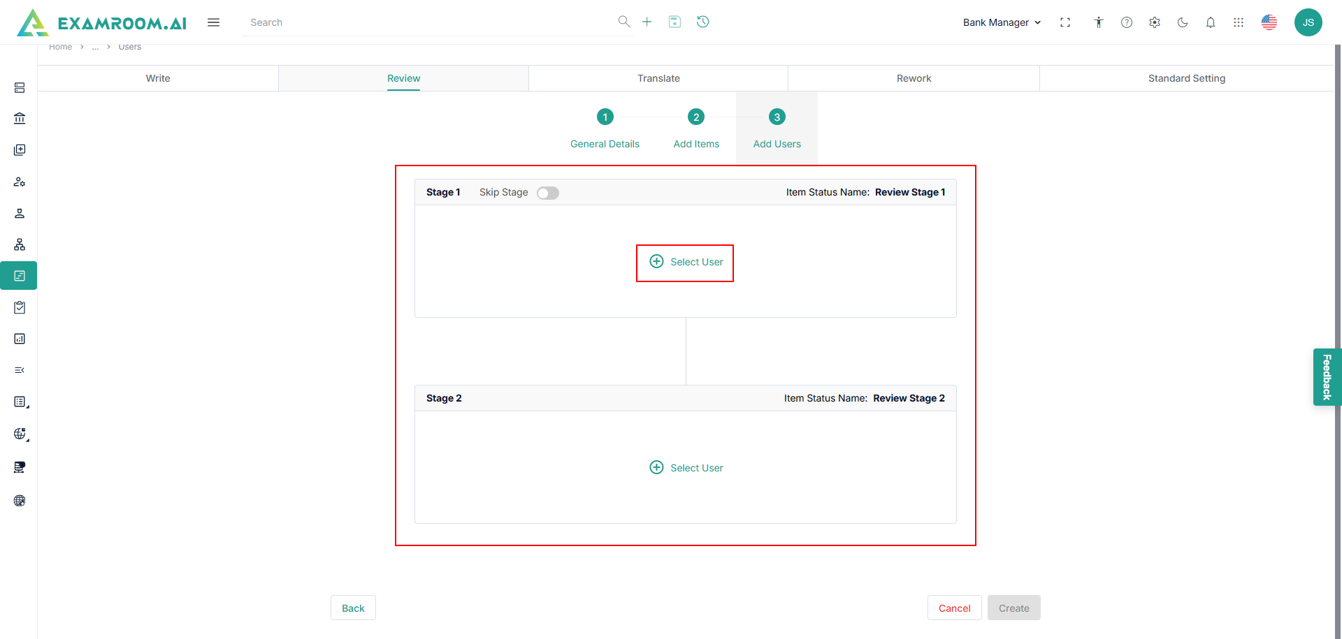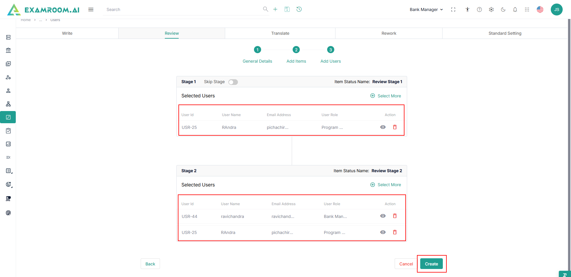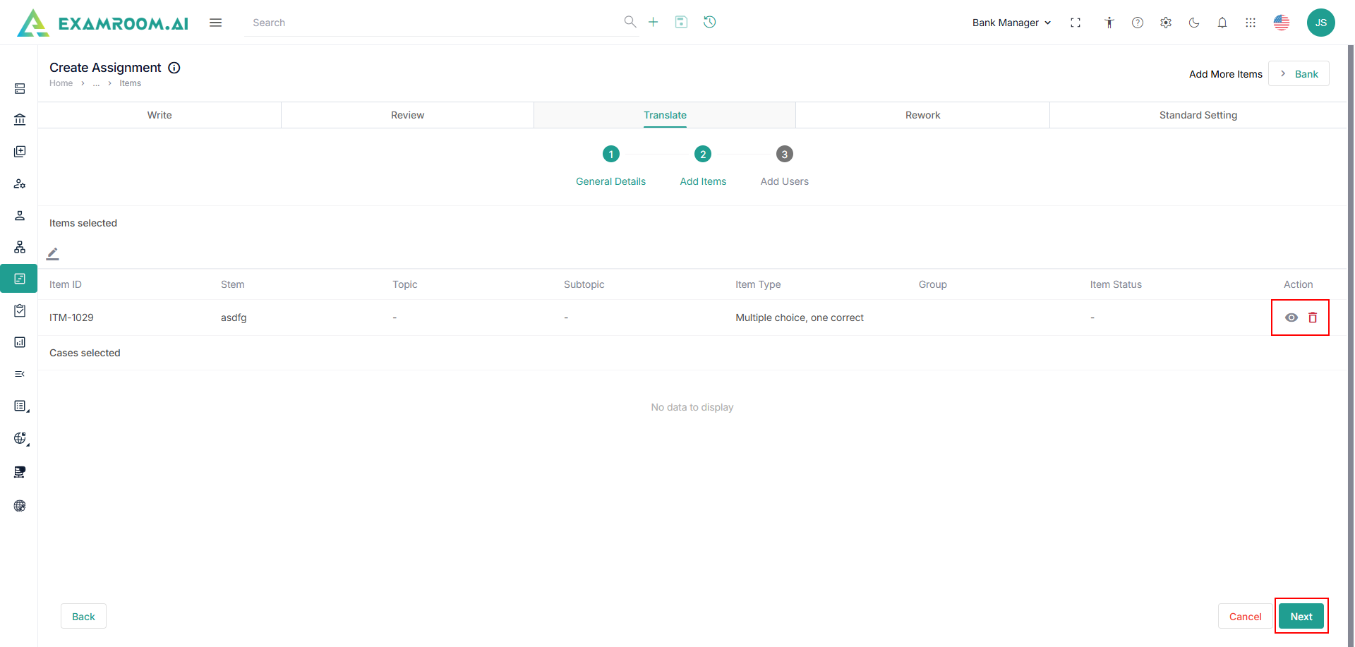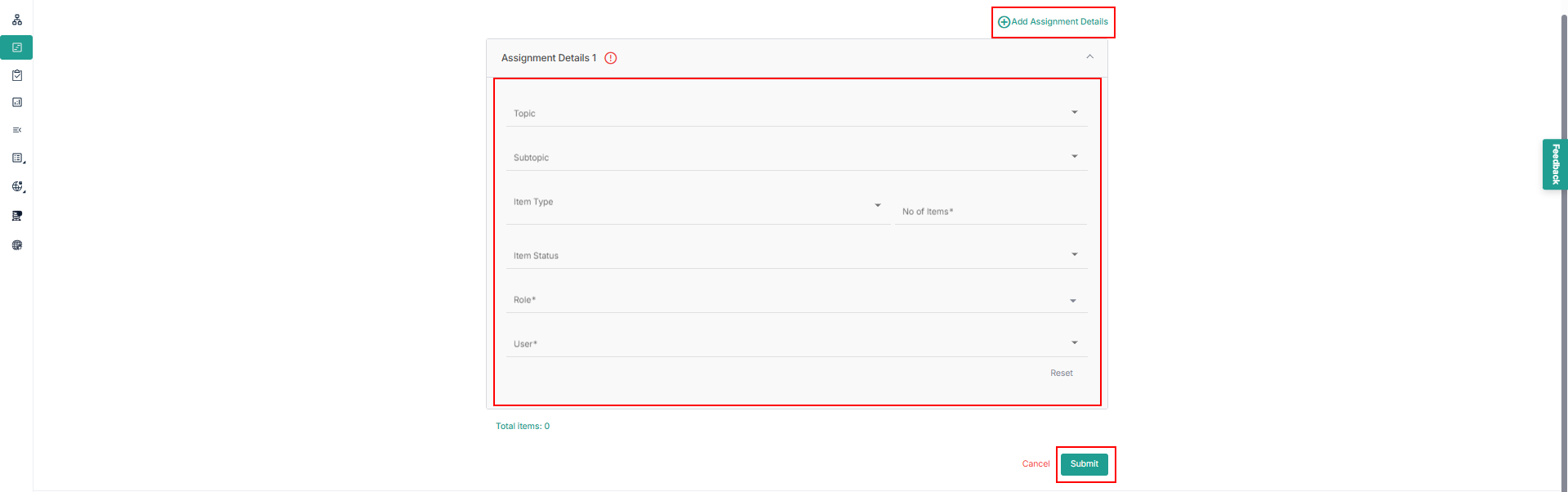 - Select the Topic, Subtopic, Item Type, No. of Items, Role, and User.