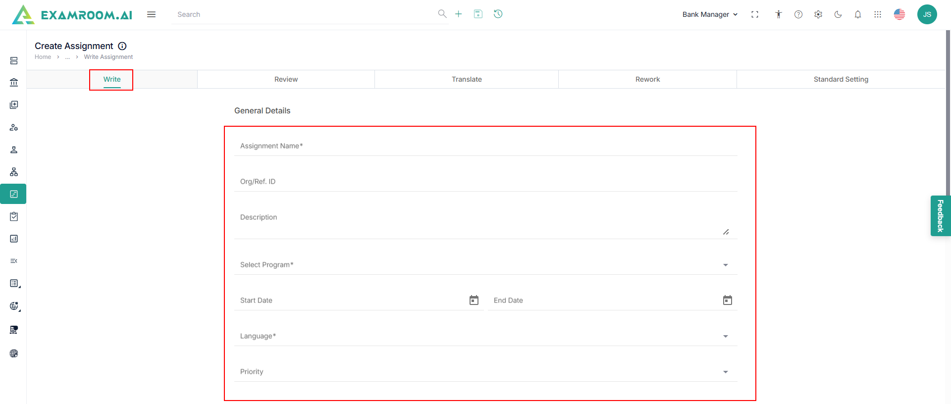 - The Create Assignment information page is displayed with Write, Review, Translate, and Rework options.