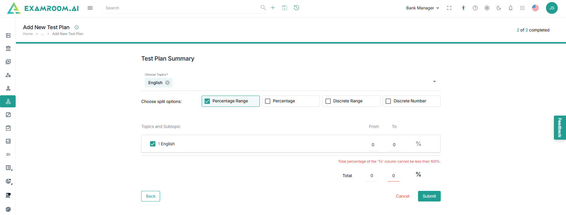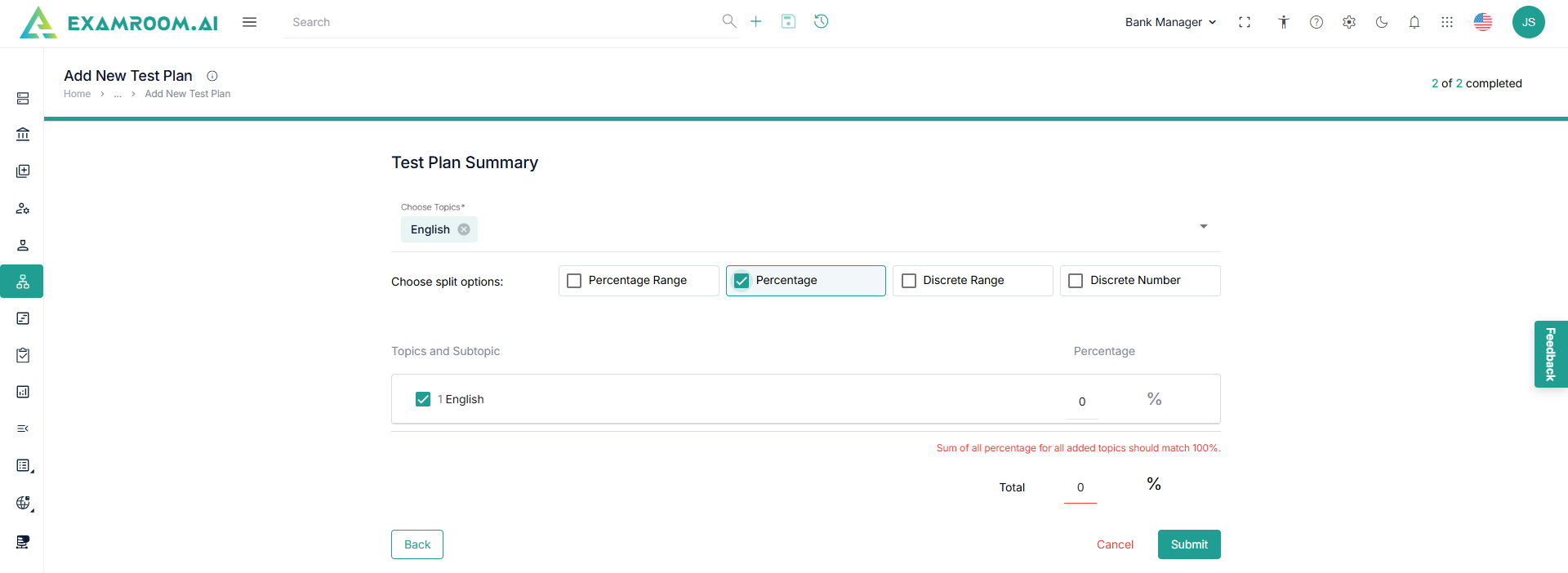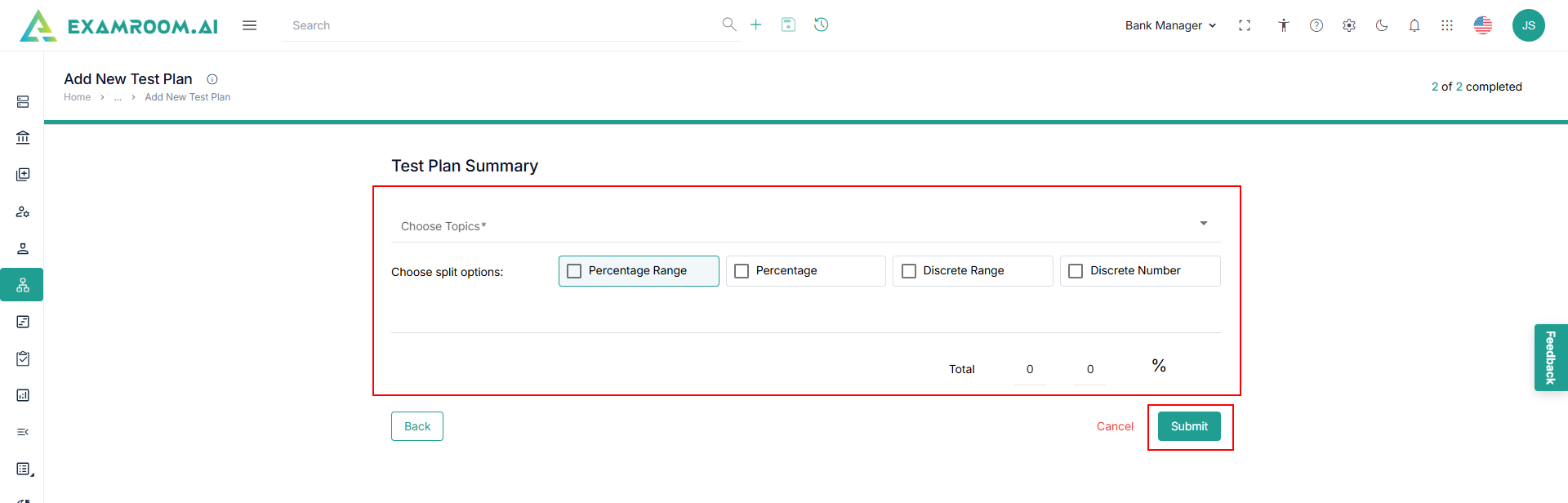 Note: You should have already added the topics for the selected program to choose from the dropdown list. To add topic, refer to Add New Topic. - Check Choose Split Options from the checkboxes.