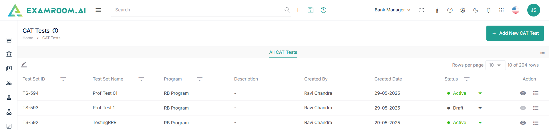 - The application displays the CAT Tests page in a table view comprising of the CAT tests list.