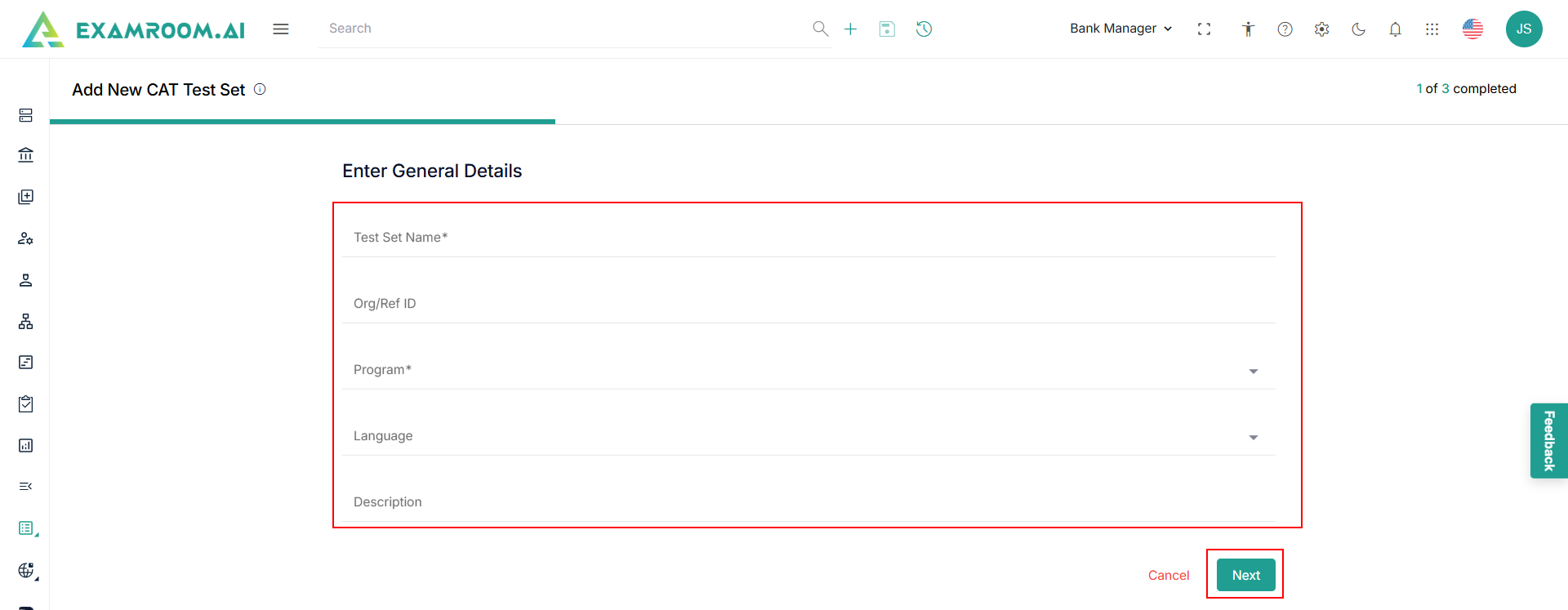 - Enter the Test Set Name, Org/Ref ID, and Description.