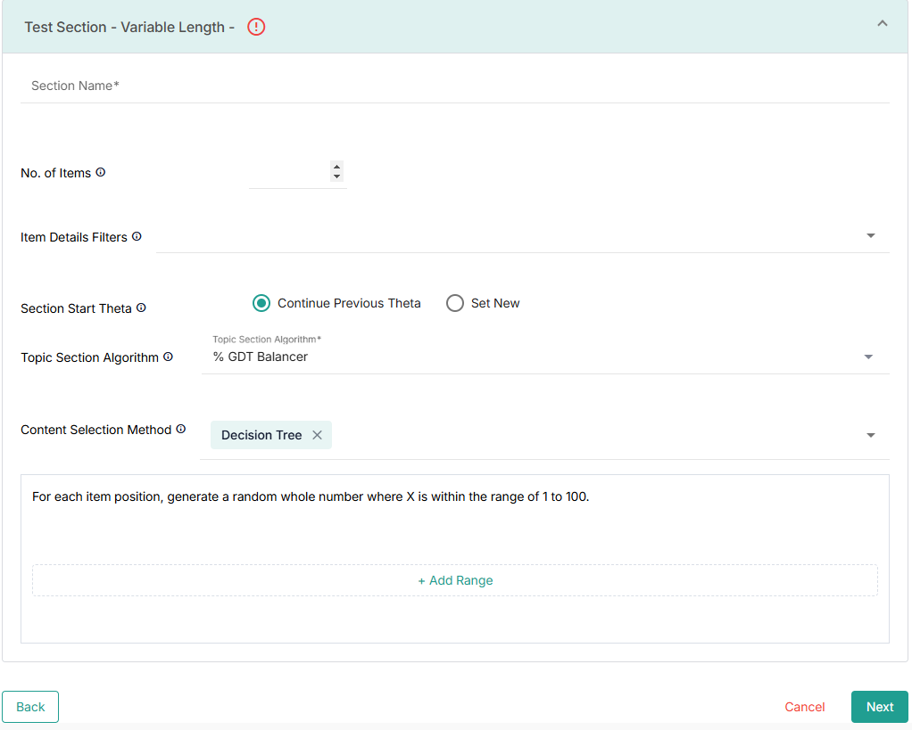 - When you select "Decision Tree" from the Content Selection Method, the "Test Plan" and "Schema" dropdowns are grayed out.
