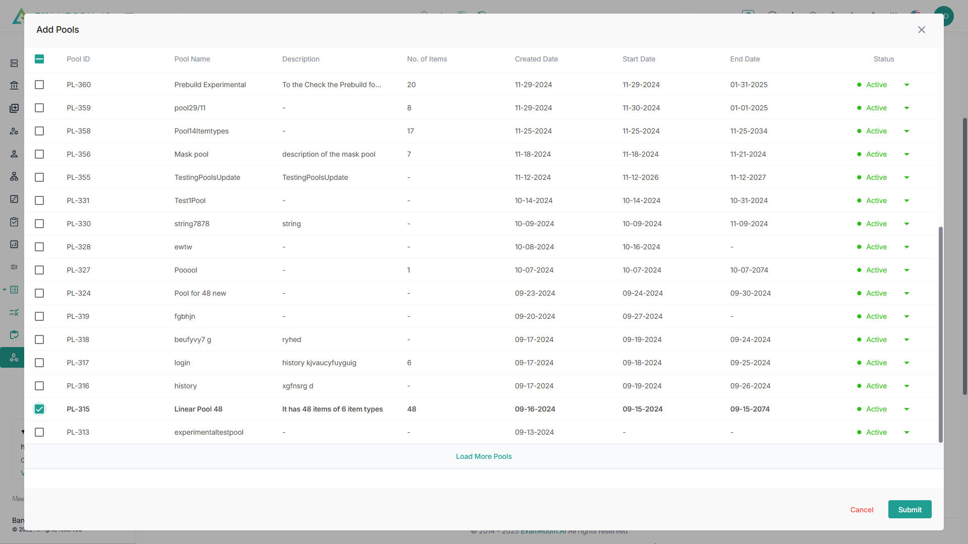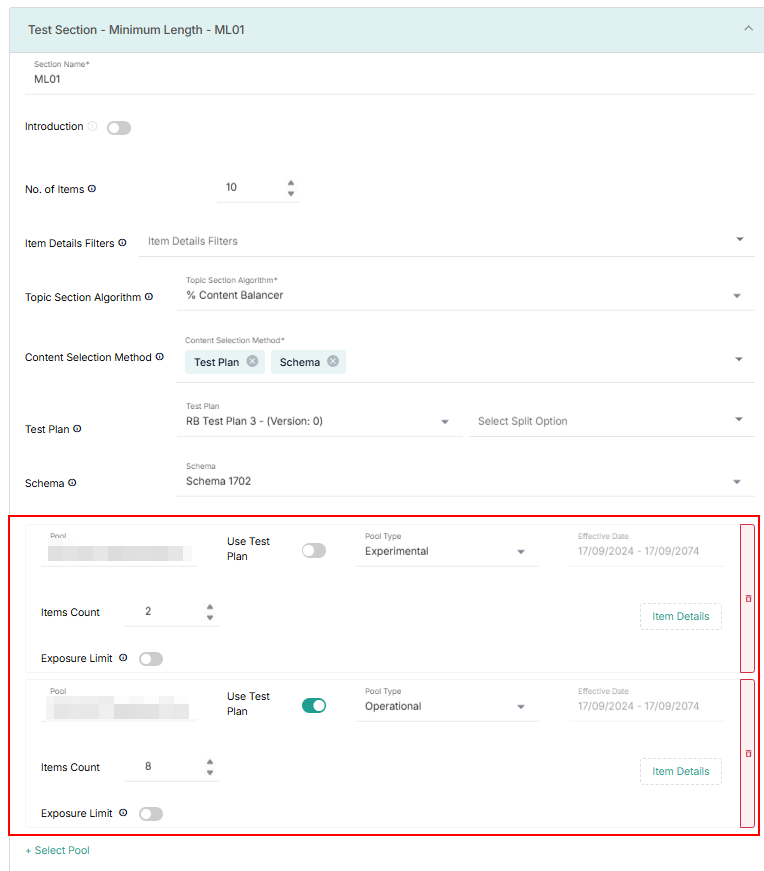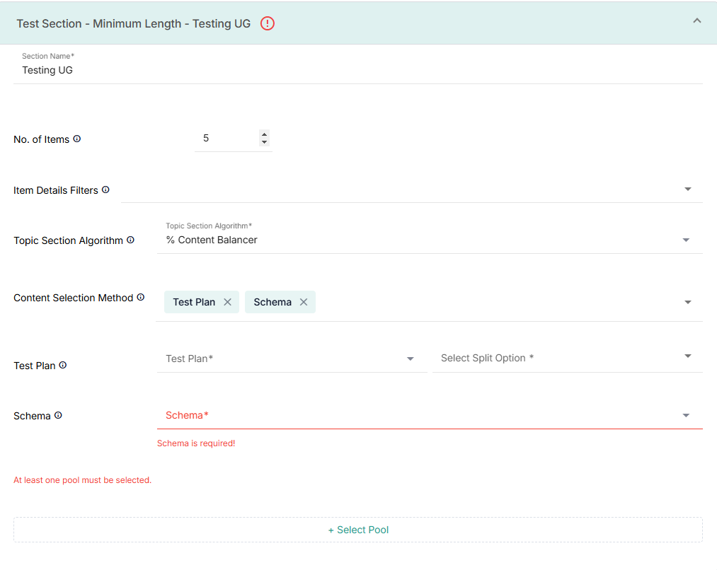 Note: You can view the Schema dropdown, which has already been configured during the Schema creation. For more information on Schema creation, refer to Schemas. - Click Select Pools to add required pools to the Test Section.
