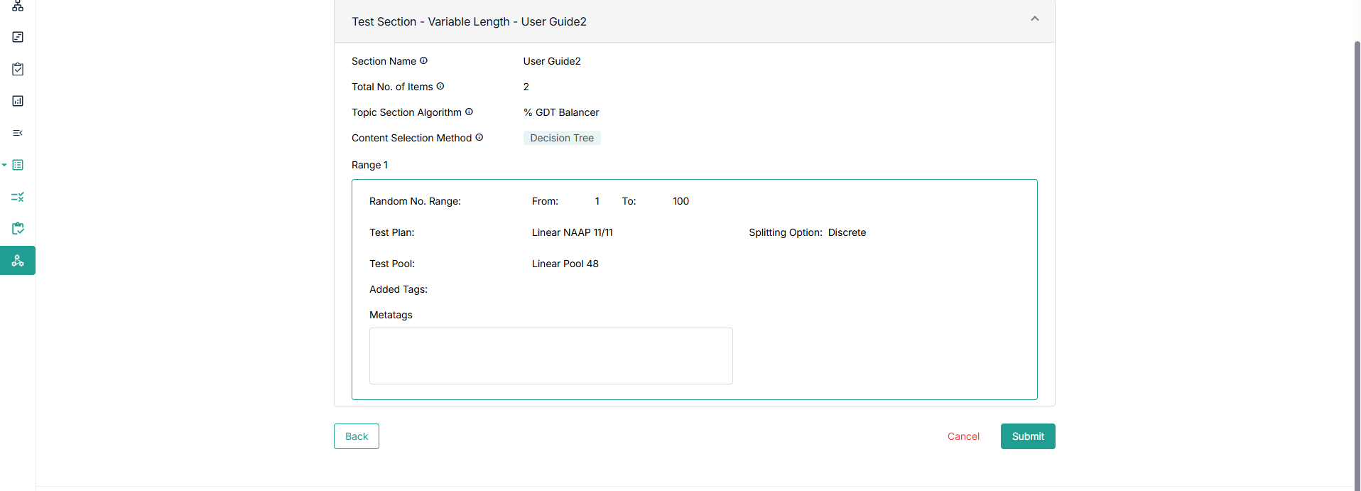 Note: When Test Plan and Schema is selected from the Content Selection Method dropdown, the following additional details are displayed.