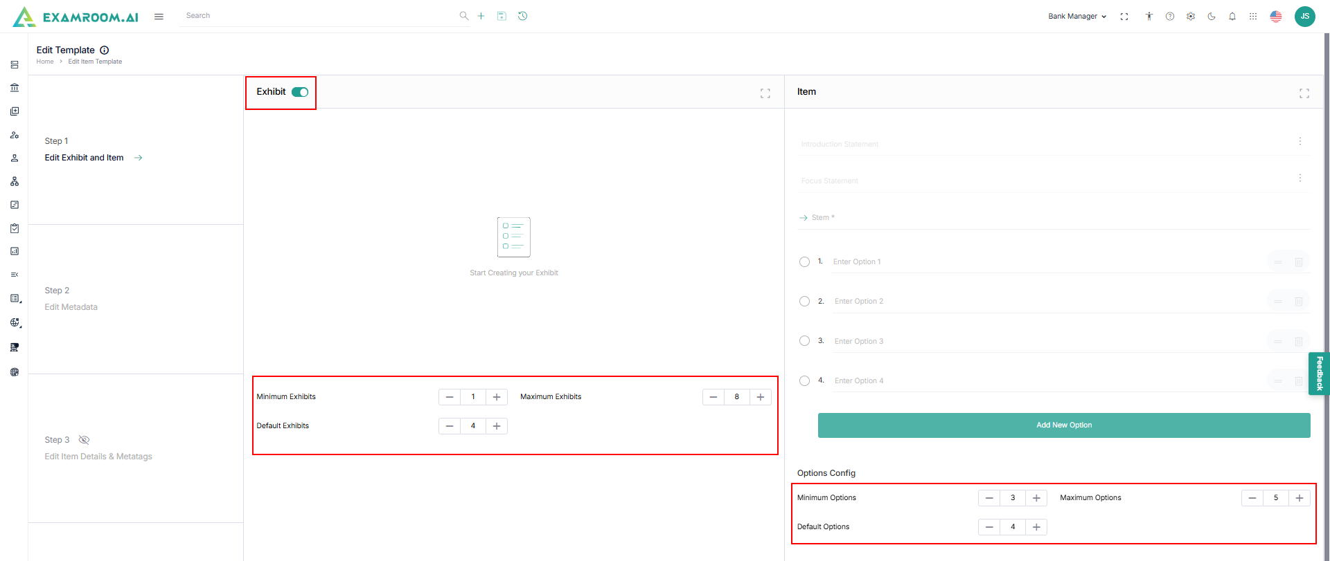 Note: When creating the item, you can include exhibits according to the number specified in the item framework. - Under option configuration, set the minimum and maximum exhibits options.