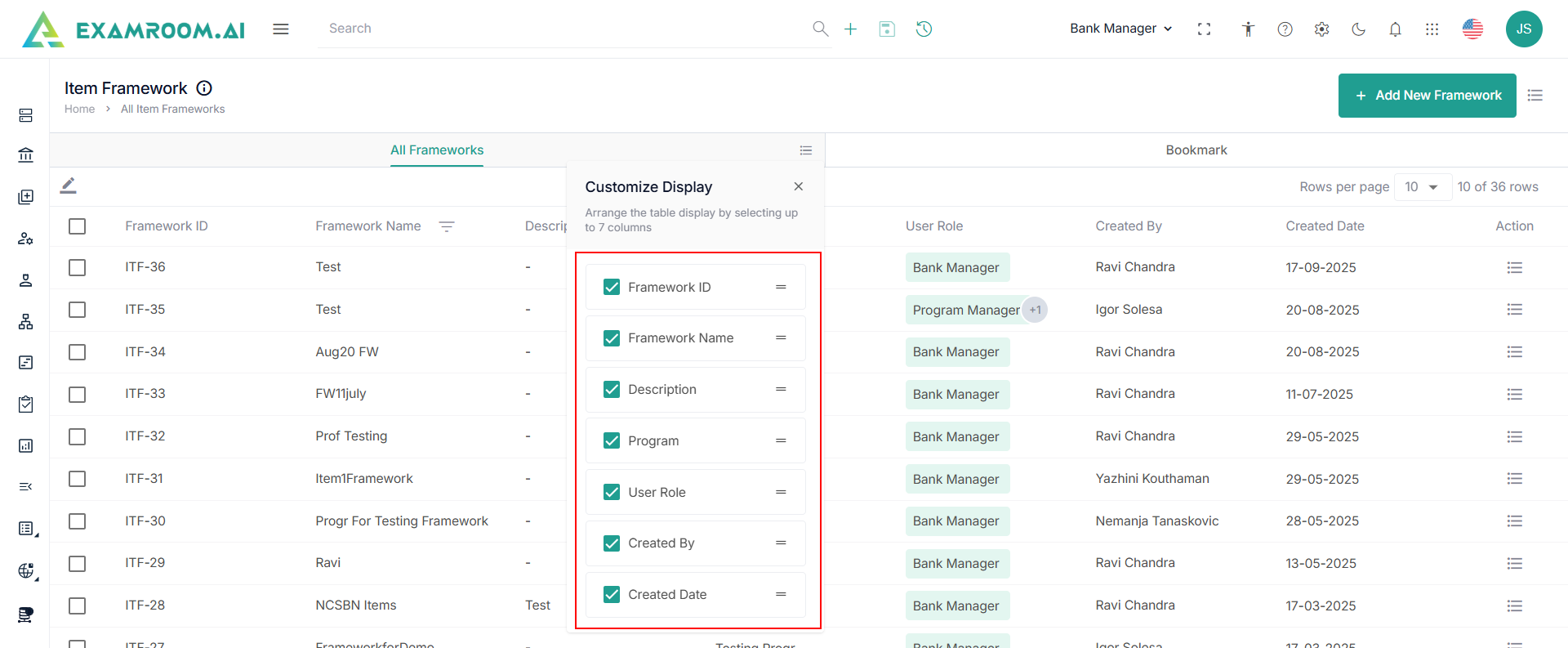 - Click the Hamburger Menu at the right of All Frameworks, to view the Customize Display of the tab columns/headers.