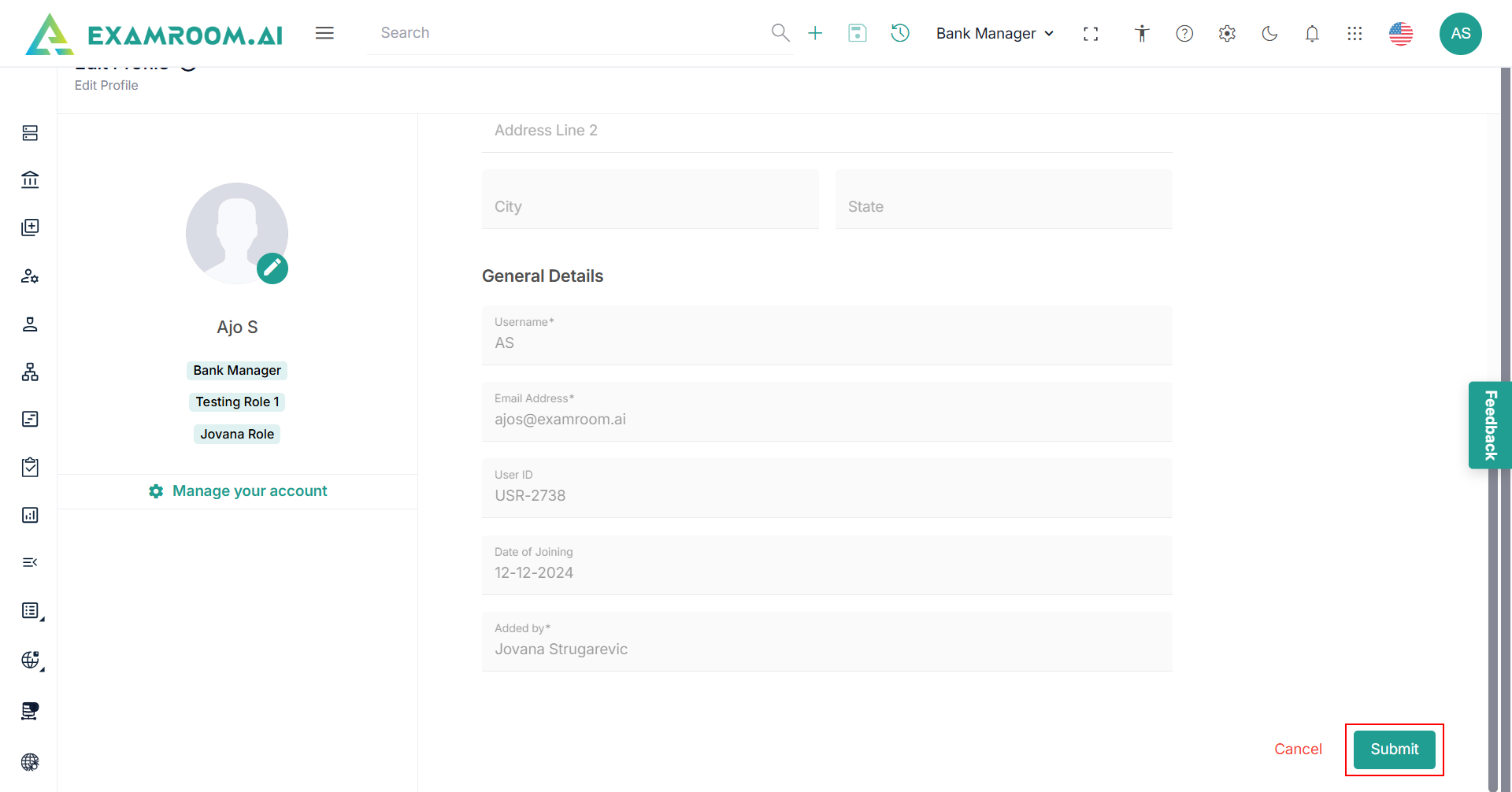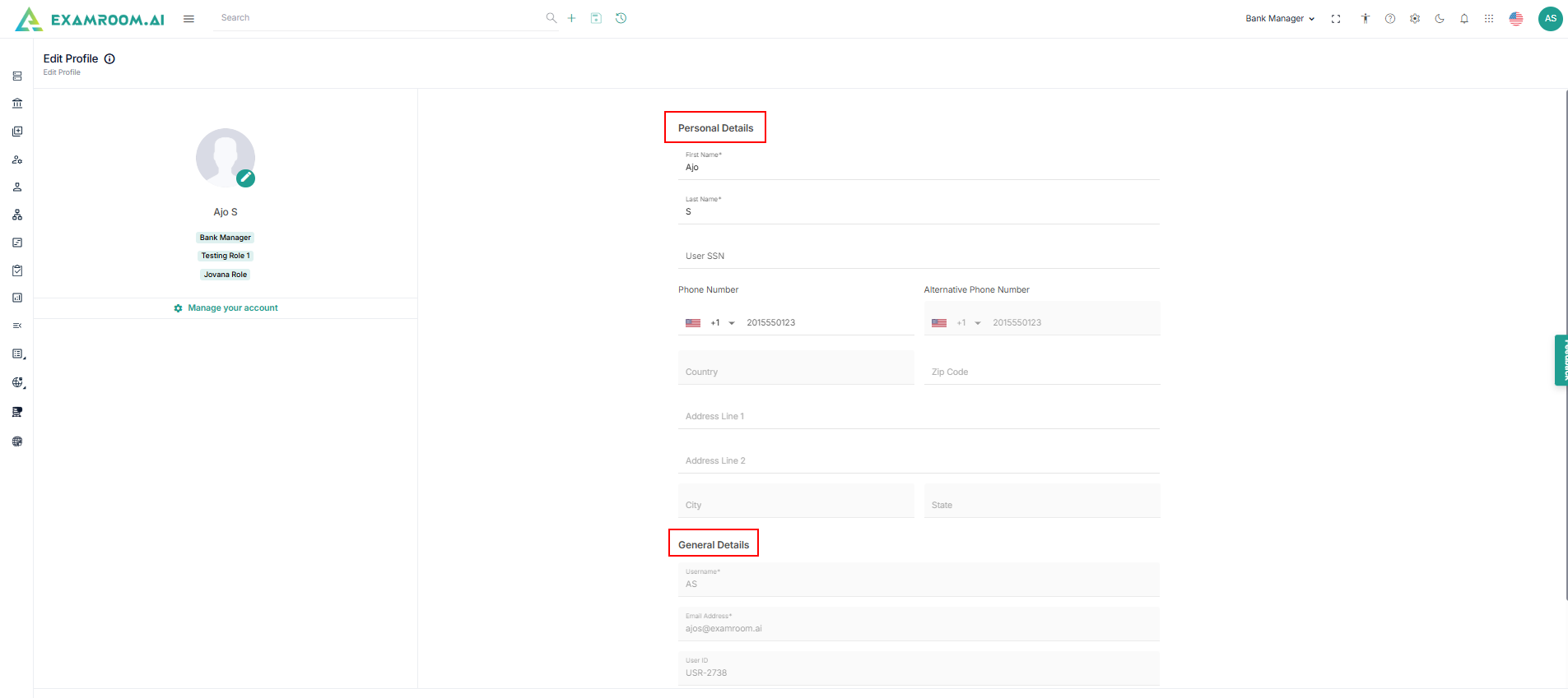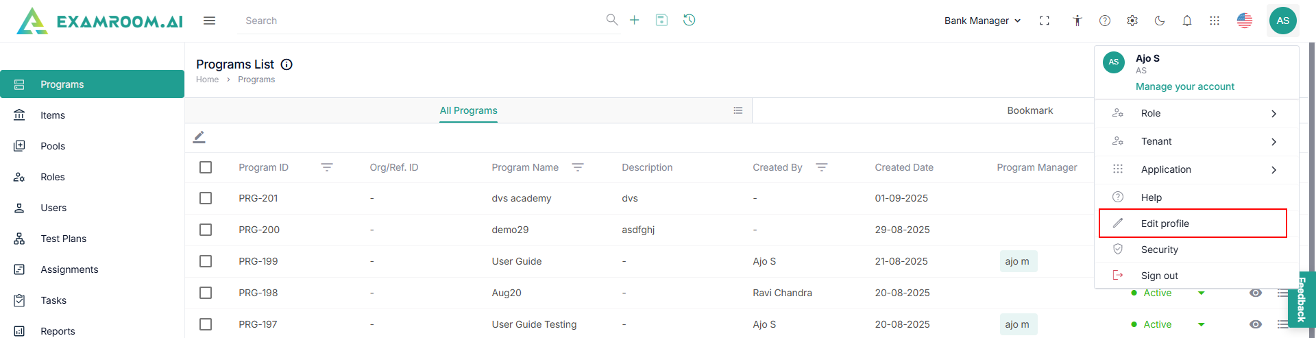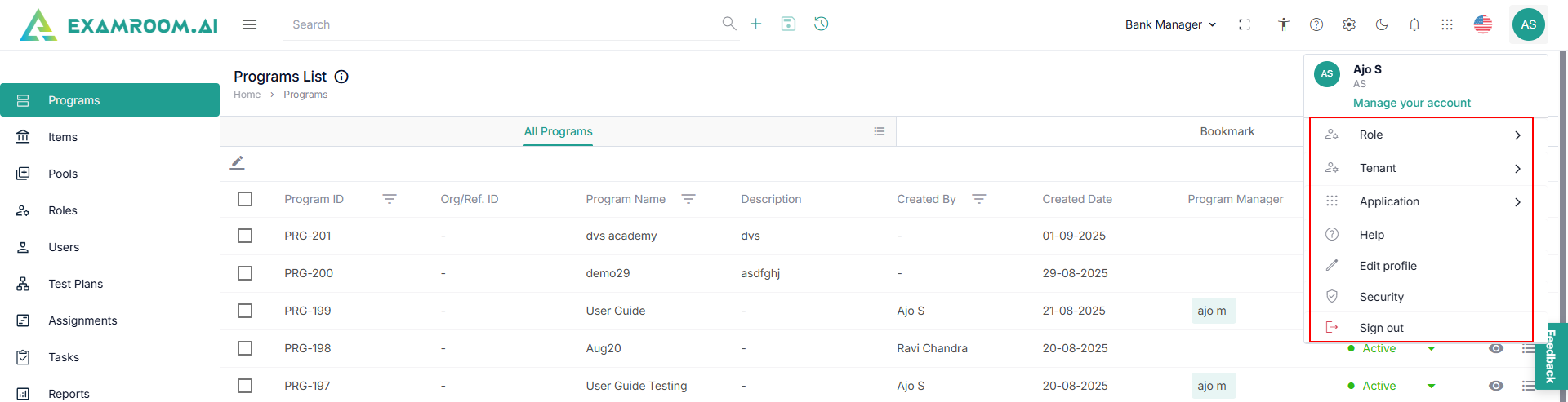 In the Manage Profile section, you can view, add, modify, and manage your account, including access to user manuals, themes, help, security, and view your Roles and Tenant.