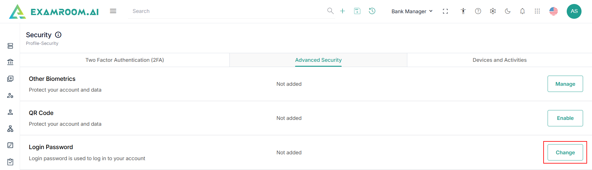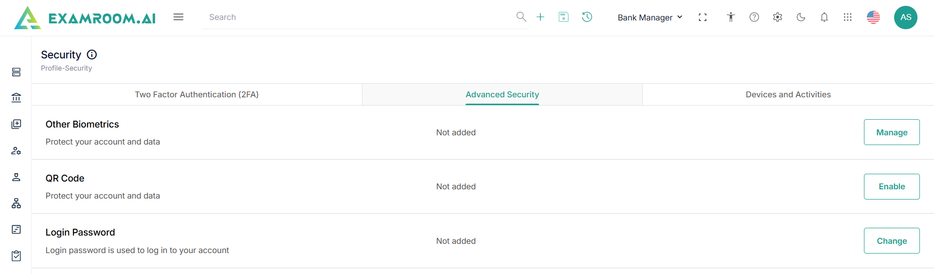 Set up and manage your login in the Advanced Security Setup section. In this section, you have other biometrics to set up and manage fingerprint scanners and voice biometrics, QR Code to set and manage the QR code login option, and a login password to update/change your login password. These various advanced login options are for hassle-free and secure login.