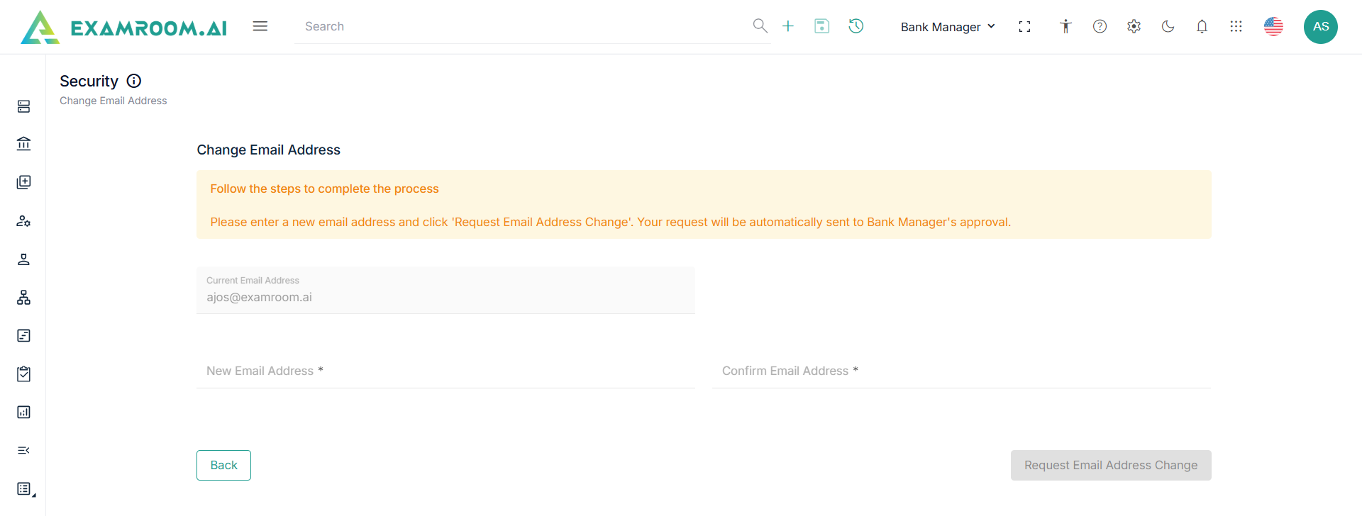 - Click Request Email Address Change. The application request will be automatically sent to the Bank Manager for approval.