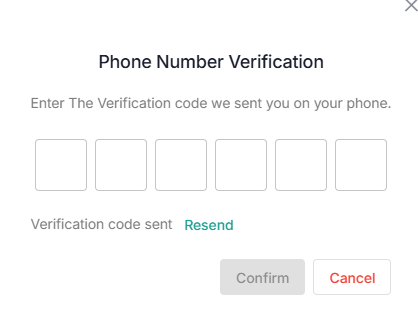 Note: A one-time code is sent to the number, and a pop-up window will appear on the screen to enter the code. - Enter the 6-digit verification code in the box and click Confirm.