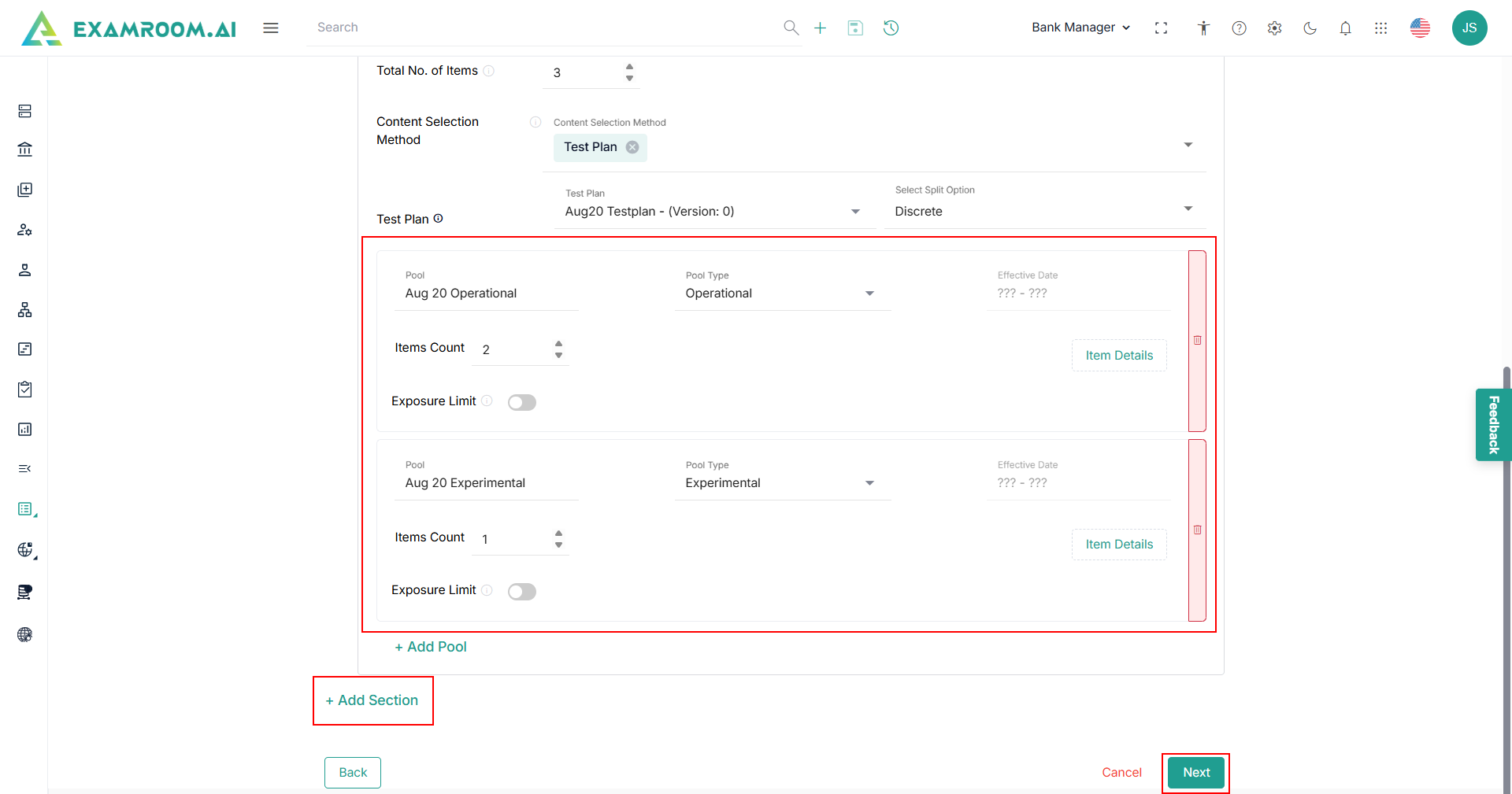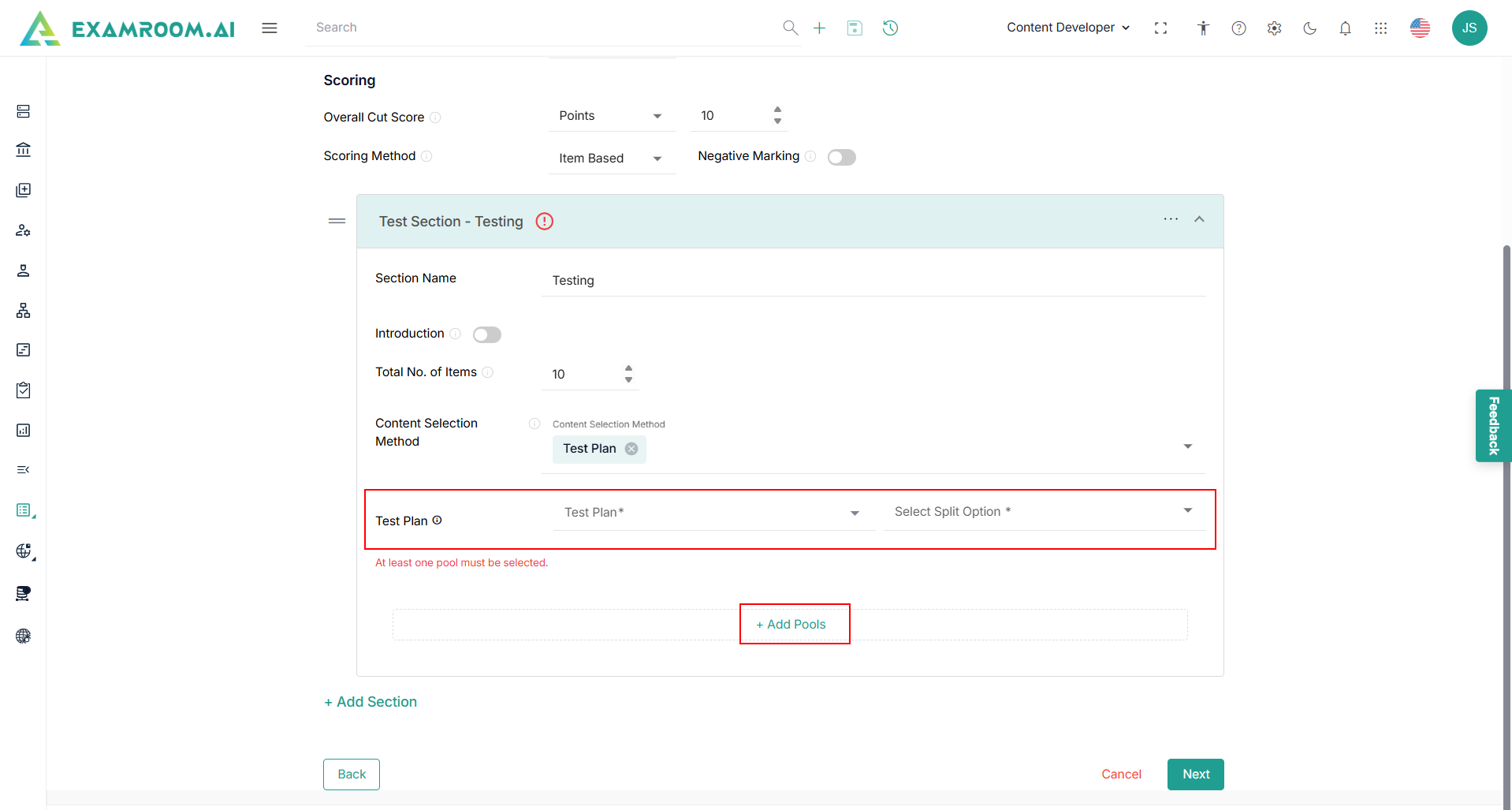 - Click Add Pools to select required Pools for the Test Section.