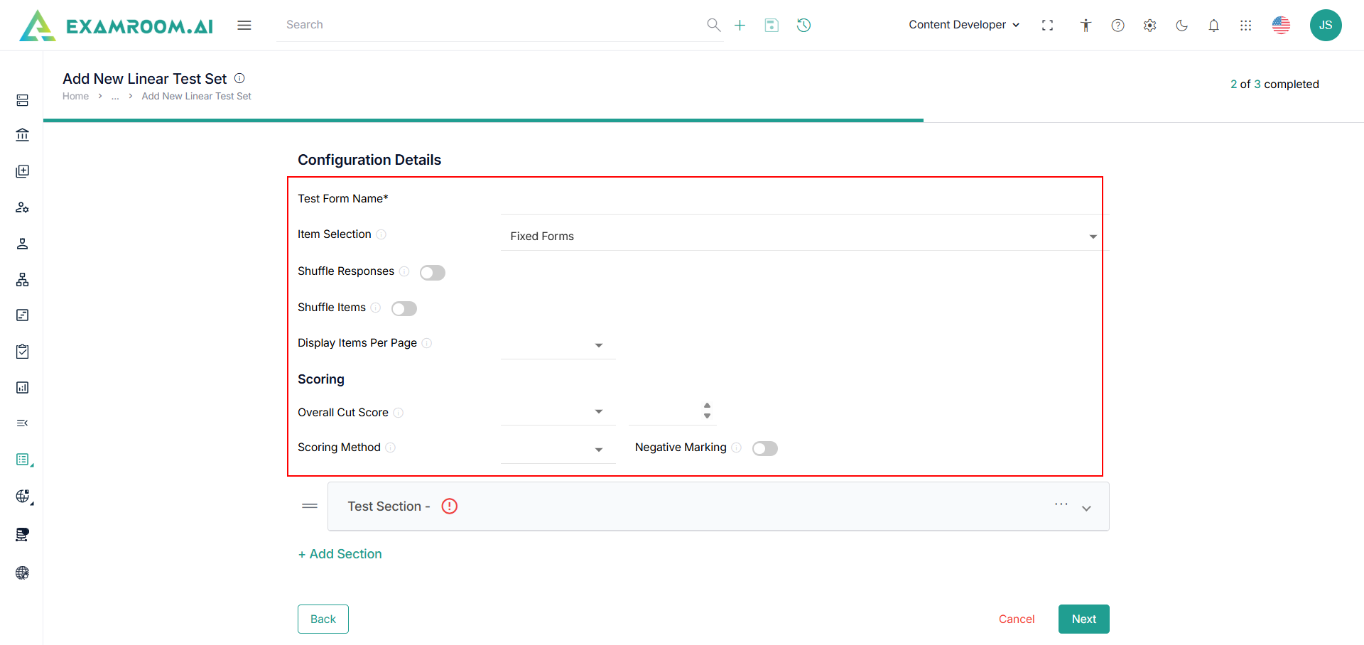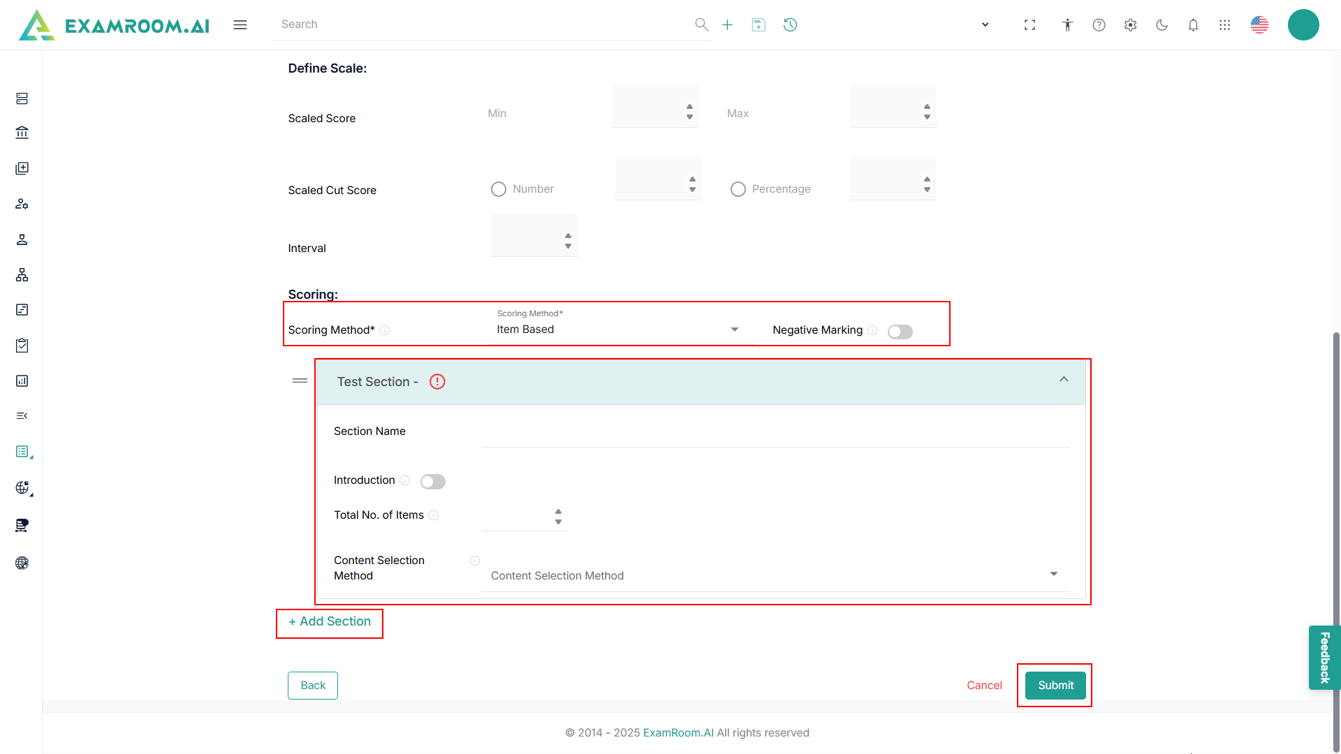 - Click Add Section to add more test sections.