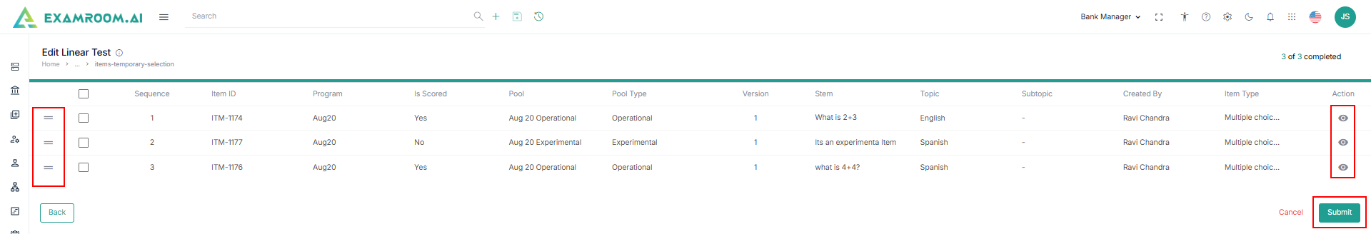 - Click Submit to submit the item selection and sequence.