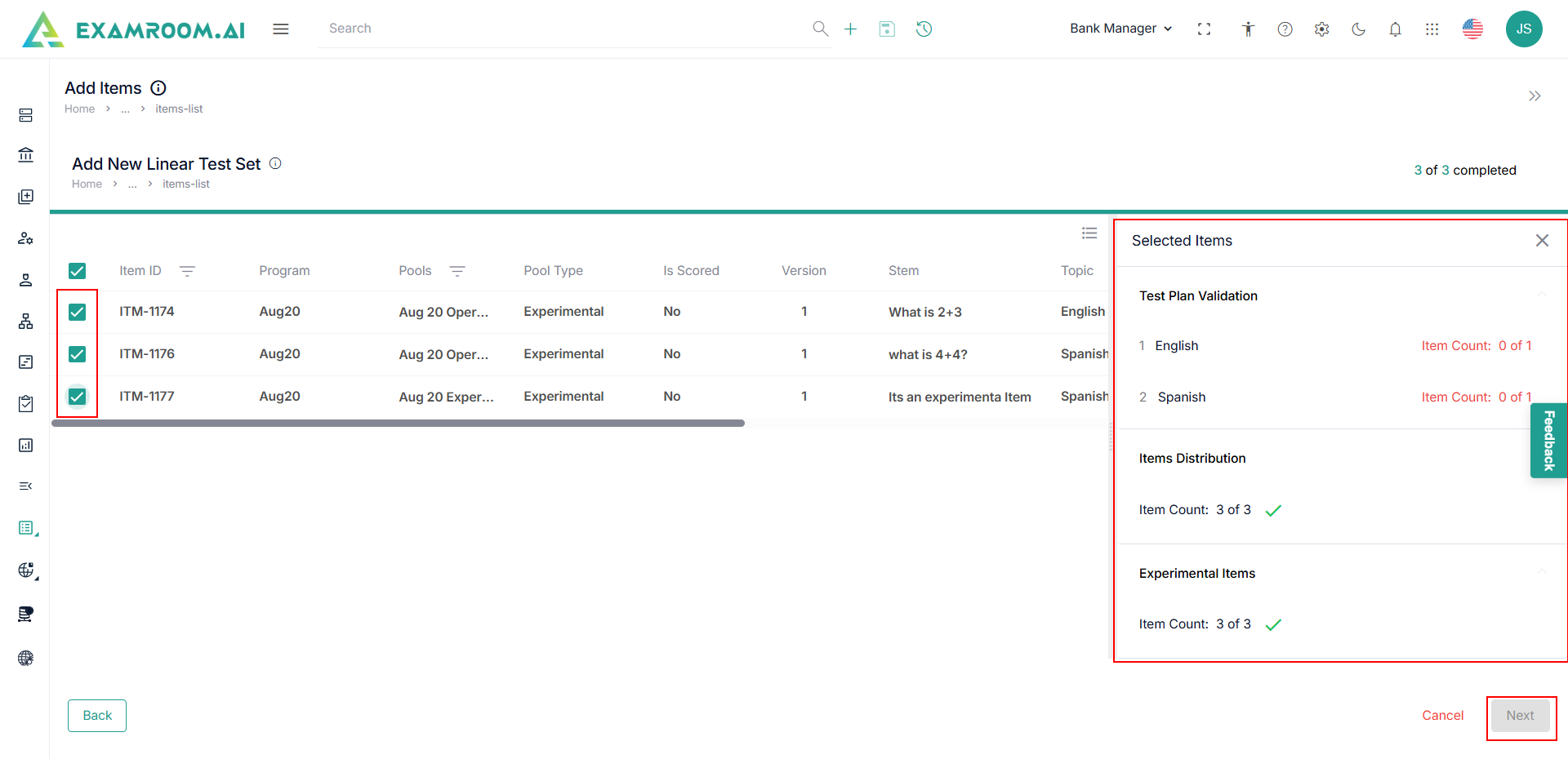 Note: Under the Selected Items side panel, the Test Plan Validation section and the Item Distribution section are displayed. - Click the checkboxes to select the items.