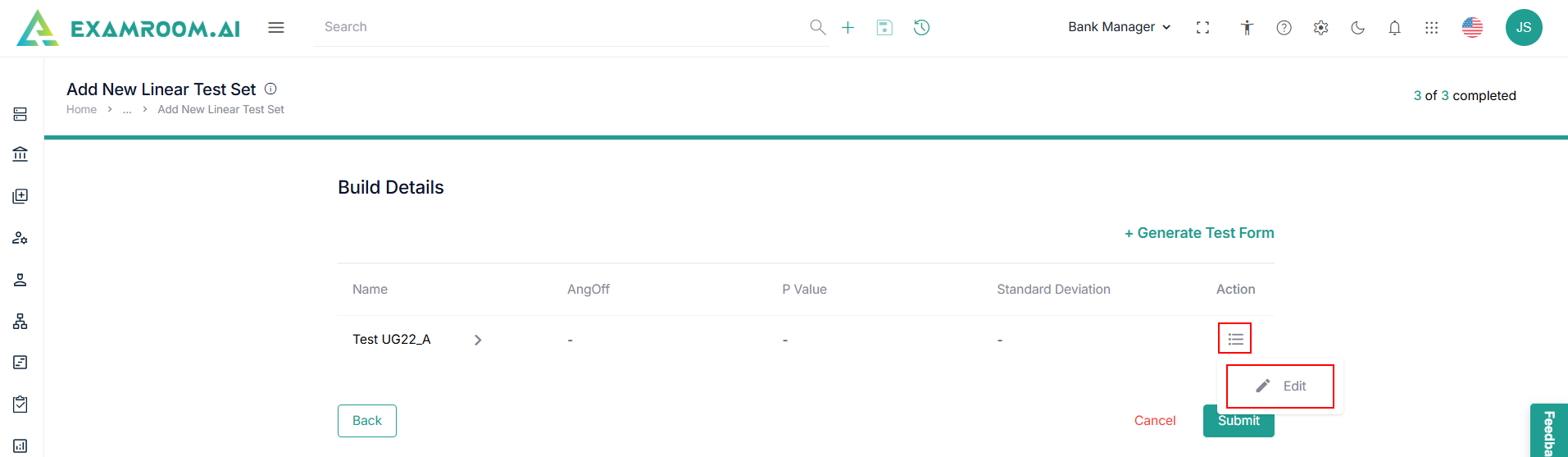 - View the Build Details page and click Submit to add new linear test set.