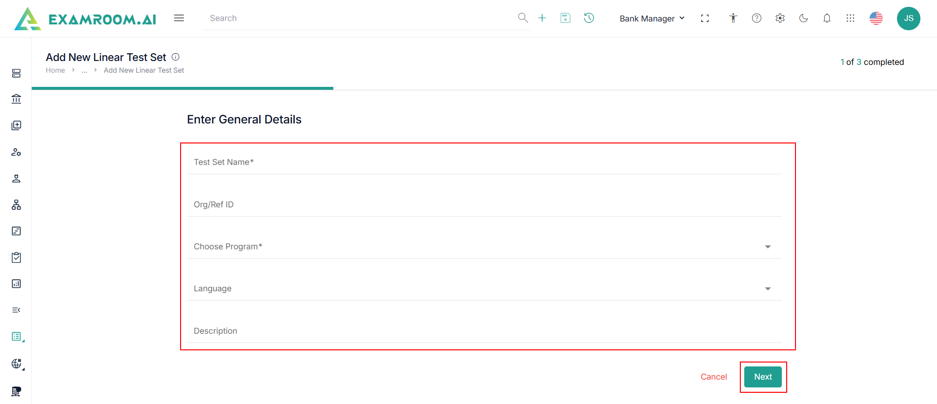 - Enter the Test Set Name, Org/Ref ID, and Description.