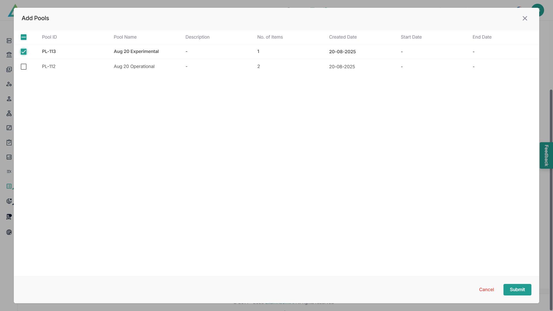 - Click the checkbox to select the pools and click the Submit button.