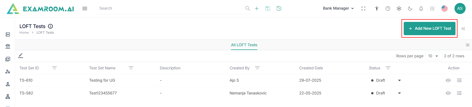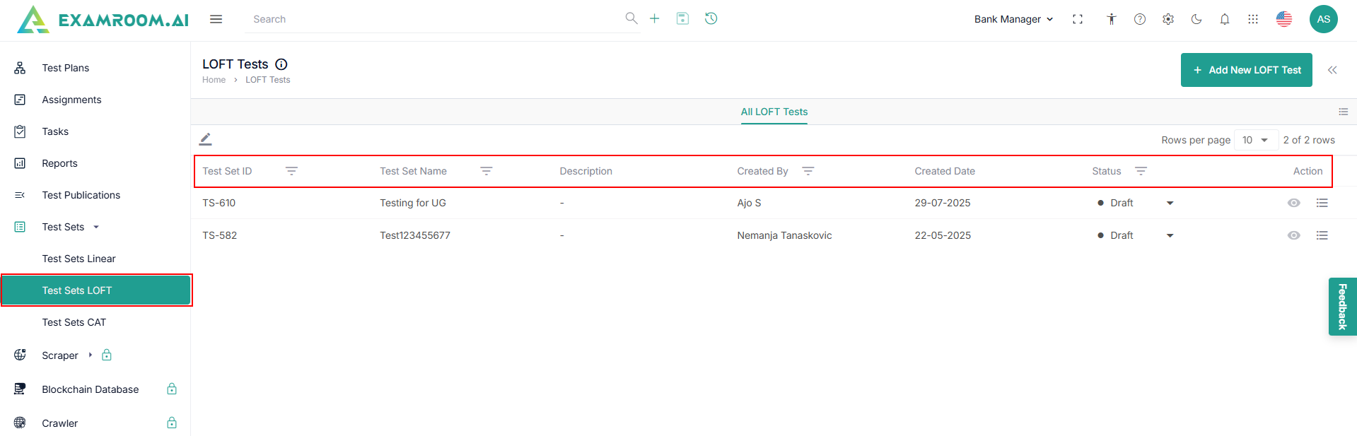 - Navigate to the left navigation menu and select LOFT Test Sets.