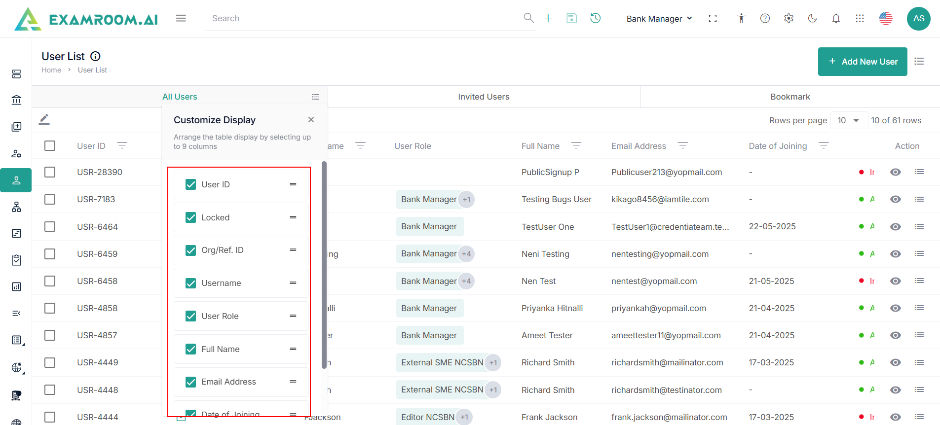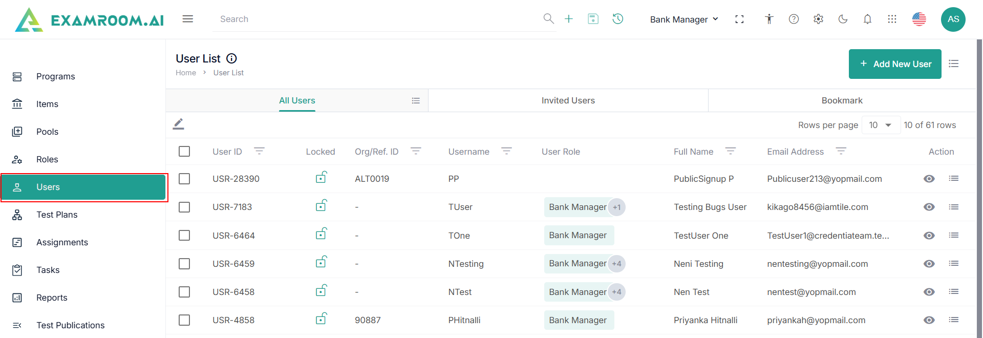 In the User List section, you can view, manage, and create new users, send invitations to add new users, and add users using a bulk import option. Users can have multiple assigned roles.